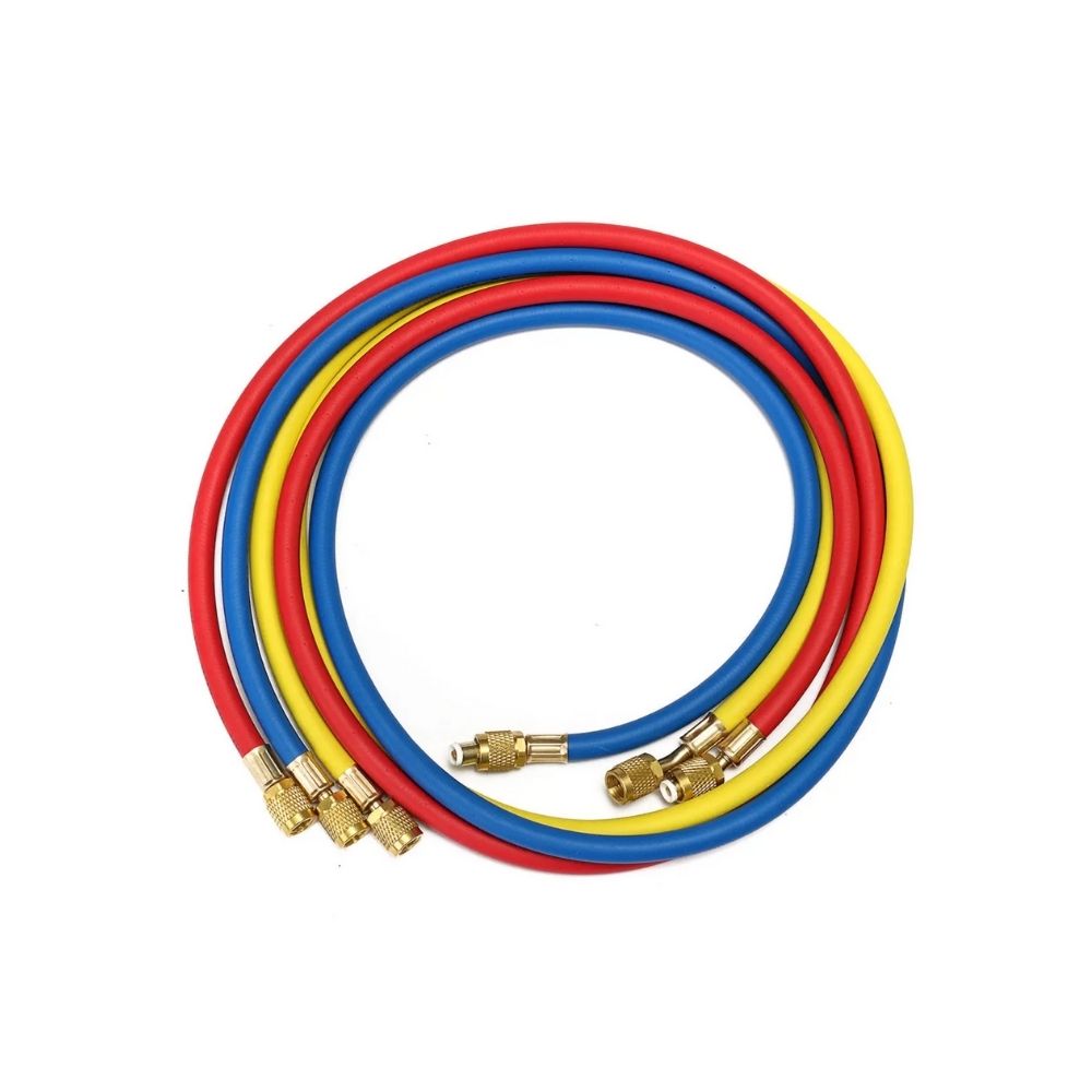 Con valvula de bola. Codificacion de colores y conexiones 5/16". Largo 1.5 mts c/u. Presion de trabajo 8 bar, presion de optima 300 bar. Apto para R410A